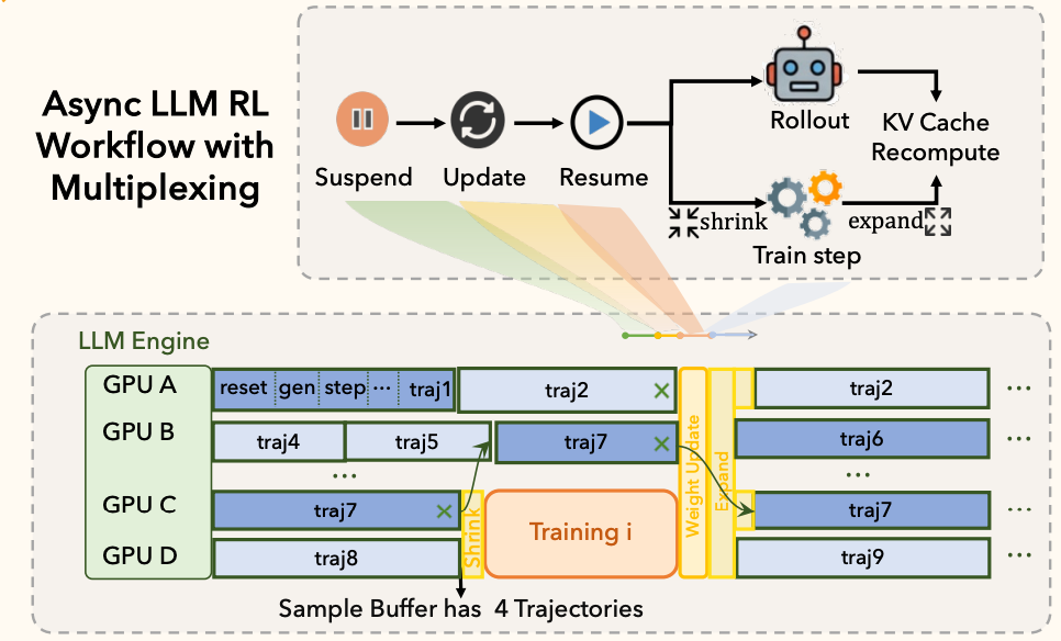 Shrink 操作:当 Sample Buffer 攒够了要训练的数据,系统利用 Rollout 处于”低谷”(大部分样本生成完了,只剩长尾在跑)的时机,迅速把空闲下来的 GPU 划拨给 Train 节点。