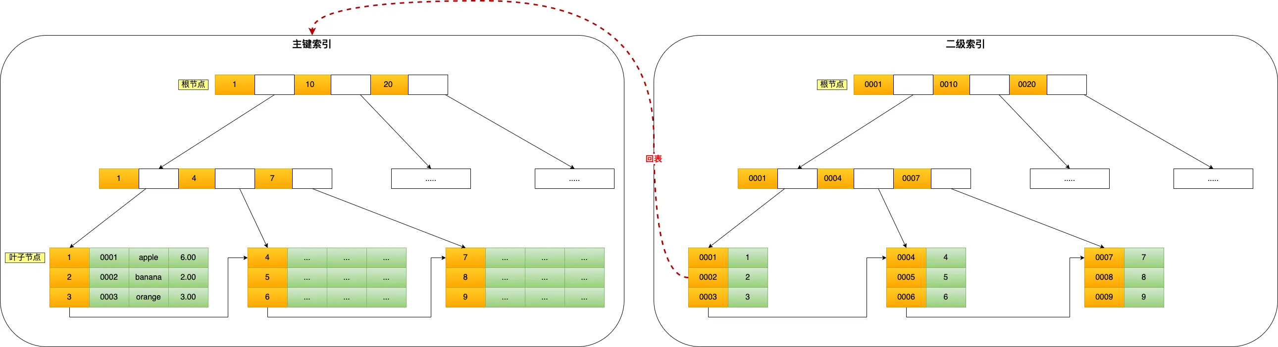 从物理存储的角度来看,索引分为聚簇索引(主键索引)、二级索引(辅助索引)。二级索引如果查询的不是主键(或者联合索引的值),需要进行**回表**