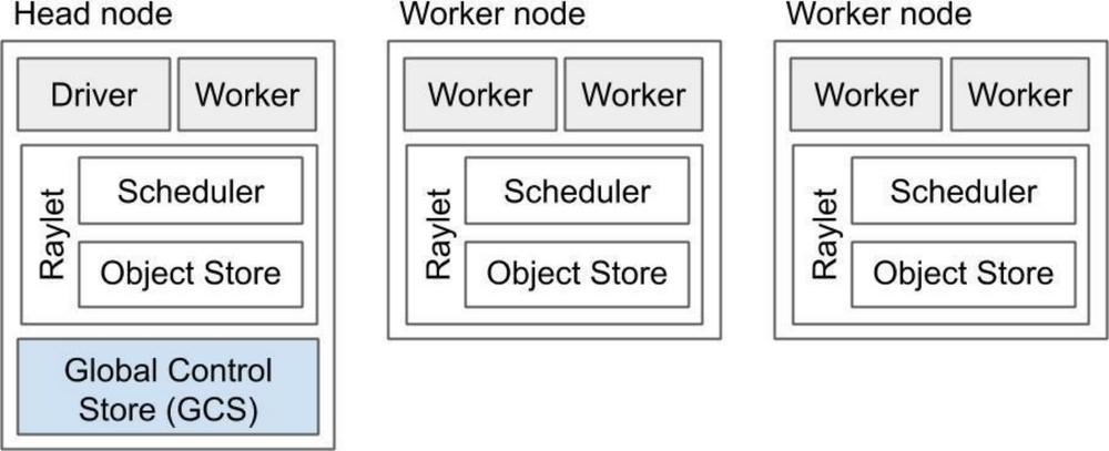 Head node: 除了有worker和Raylet外还会托管 GCS 和 Driver。包含了自动缩放、任务提交功能