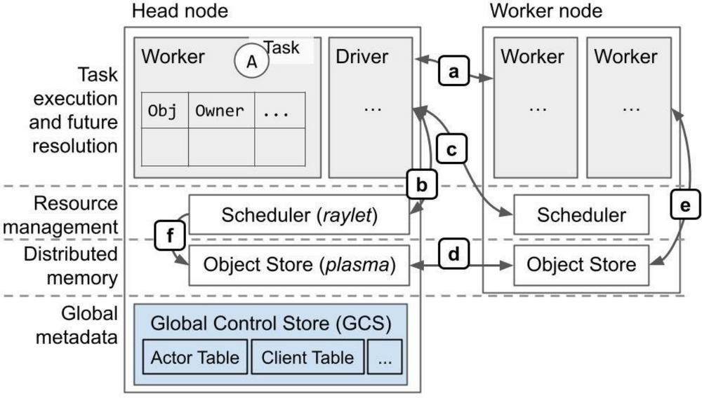 Ray使 用了包括分布式引用计数和分布式内存等组件,这些组件增加了体系结构的复杂性,但对性能和可靠性来说是必需的。