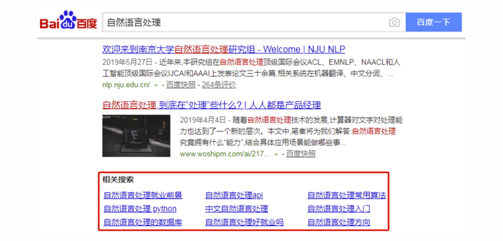 Query扩展,即通过挖掘query间的语义关系扩展出和原query相关的query列表。Query列表的结果可以用于扩召回以及进行query推荐帮用户挖掘潜在需求,如下图在百度搜索“自然语言处理”扩展出的相关搜索query: