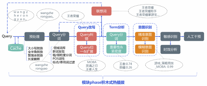 当然,这个pipeline不是通用的,不同的搜索业务可能需要结合自身情况做pipeline的调整定制,像百度这些搜索引擎会有更为复杂的query理解pipeline,各个模块间的依赖交互也更为复杂,所以整个qu服务最好能灵活支持各个模块的动态热插拔,像组装乐高积木一样进行所需模块的灵活配置,下面对各个模块做进一步详细的介绍。
