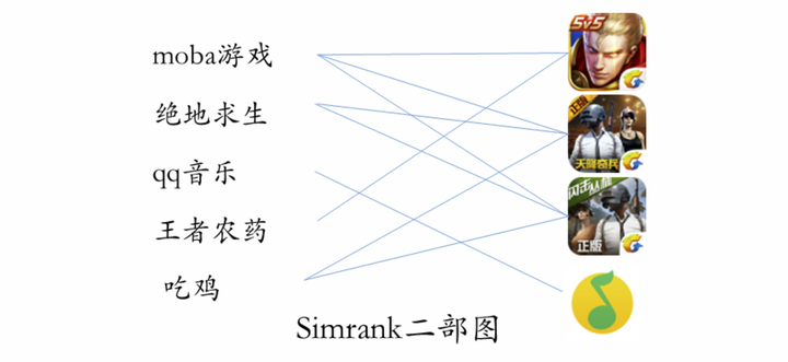 至于搜索点击下载行为,可以通过构建query-item的点击下载矩阵,然后采用协同过滤或SVD矩阵分解等方法计算query之间的相似度,又或者构建query和item之间的二部图(如下图示例),若某个query节点和item节点之间存在点击或下载行为则用边进行连接,以ctr、cvr或归一化的点击下载次数等作为连接边的权重,然后可以训练swing、simrank/wsimrank++等图算法迭代计算query间的相似度,也可以采用Graph Embedding的方法来训练得到query结点间的embedding相似度。