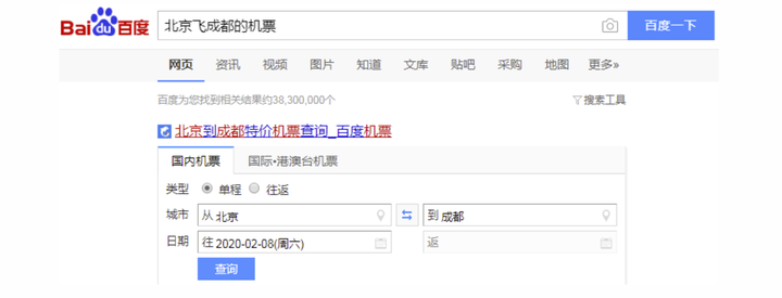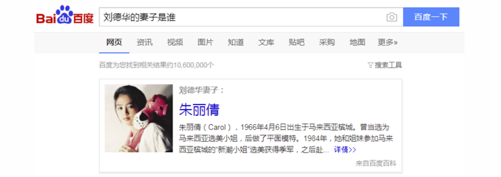 在Google、百度等通用搜索中,用户可能会输入一些知识问答型的query,此时用户的意图也比较明确,就是问题对应的答案。如搜索query“刘德华的妻子是谁”,通过召回带“刘德华”、“妻子”字样的网页,用户估计也能找到答案,但如果能直接给出这个query的答案的话体验会更好,如下面百度搜索给出的结果。