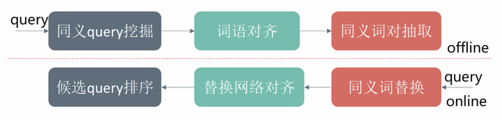 考虑到同一个词语在不同的上下文中可能表达不同的语义,同义词语间的关系也是上下文相关的,此时如果通过对齐挖掘粗粒度的同义片段对能进一步消除歧义。线上对query进行归一时,则和离线同义词挖掘的过程相反,对query进行分词后读取线上存储的同义词表做同义词候选替换,对替换网格进行对齐生成候选query,最后通过结合语言模型概率及在当前上下文的替换概率或者构造特征训练GBDT等模型的方式对候选query进行排序得到最终的归一query。