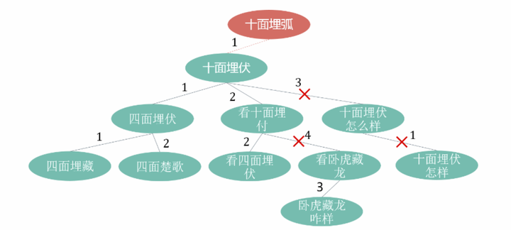 首先随机选取一个query作为根结点,然后自顶向下对所有query构建多叉树,树的边为两个结点query的编辑距离。给定一个query,需要找到与其编辑距离小于等于n的所有query,此时自顶向下与相应的结点query计算编辑距离d,接着只需递归考虑边值在d-n到d+n范围的子树即可。如下图所示需要查找所有与query“十面埋弧”编辑距离小于等于1的query,由于“十面埋弧”与“十面埋伏”的编辑距离为1,此时只需考虑边值在1-1到1+1范围的子树,为此“十面埋伏怎么样”作为根结点的子树可以不用继续考虑。