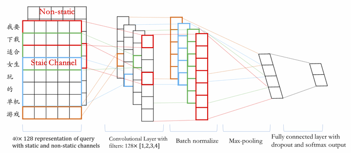 同时为进一步提升网络性能及加速模型收敛,还可以在网络中进一步考虑dropout及batch normalize等防过拟合机制,以及考虑在输入层融入Word2vec、GloVe、Fastext等模型预训练得到的embedding,如下图在cnn输入层中加入预训练embedding组成双通道输入。虽然TextCNN对于捕获长程依赖信息方面会不如TextRNN,考虑到query一般长度相对较短所以影响相对还好,而且其训练速度及在线inference性能也都比较符合要求。