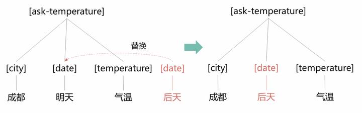 形式化表达可以递归地定义为一些子表达式的组合的形式,为进行语义解析,最主要的是确定一种形式化语言及对应的解析器,通常我们采用确定的上下文无关文法以确保形式化的每一部分都对应有一个解析树。得到query对应的形式化表示后,还可以进行一些解析树归并等形式化运算推演。为此,除了可以用来理解搜索query的结构化语义,语义解析技术也广泛应用于QA问答及聊天机器人中,如多轮对话中比较有挑战的上下文省略和指代消歧问题也可以一定程度通过将下文query对应的解析树合并变换到上文query对应的解析树中来解决。如下图例子所示,当用户在第一轮对话询问“成都明天气温?”时构造出相应的解析树,接着问“后天如何?”时就可以将日期进行替换后合并到之前的解析树中。
