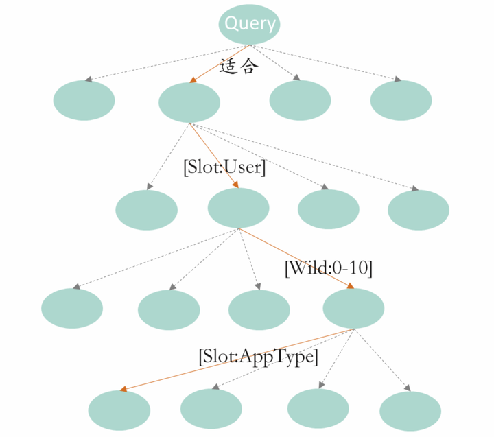 我们需要结合领域的业务知识来构造模板,构造过程需要保证模板符合语法句式规范,同时尽量保证其泛化性以覆盖更多的query问法。举个简单例子,构造模板:“适合[Slot:User][Wild:0-10][Slot:AppType]”及相应的槽位词[Slot:User]={女生,男生,小孩,老人,…}、[Slot:AppType]={单机游戏,益智游戏,moba游戏,…},然后通过构建如下图所示的相应trie树,可以自上而下遍历及回溯解析出query“适合女生玩的单机游戏”匹配上了这个模板,从而识别出query整体意图是询问女生类单机游戏,其中用户槽位值为“女生”,app类型槽位值为“单机游戏”,“适合”是固定词,“玩的”匹配通配符[Wild:0-10],基于这些槽位解析的结果,接下来可以进行一系列的决策。