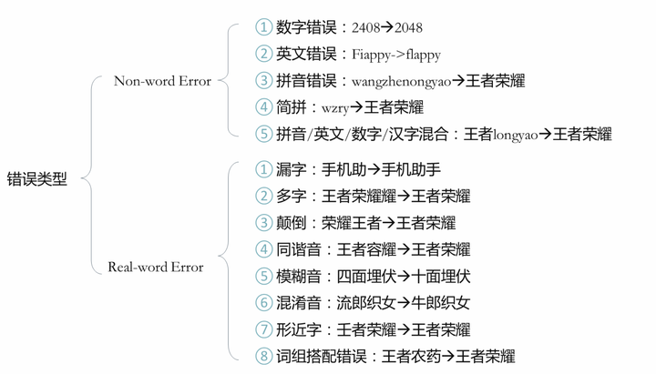 其中,Non-word错误一般出现在带英文单词或数字的query中,由于通过输入法进行输入,不会存在错误中文字的情况,所以中文query如果以字作为最小语义单元的话一般只会存在Real-word错误,而带英文数字的query则可能存在两类错误。下图对这两大类的常见错误类型进行归类及给出了相应的例子。