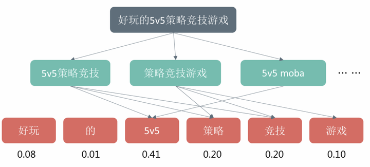 这里假设在一定共现关系情况下越短的query越是整体意图的核心表达,所以和越下层结点连接越多的term重要性越大,仅和较上层或根结点有连接的term重要性相对较小,通过用iqf等初始化叶子结点,然后自底向上进行结点分值计算并进行多轮迭代使得term权重相对稳定。如下图所示query“好玩的5v5策略竞技游戏”构造的短语生成树示例。